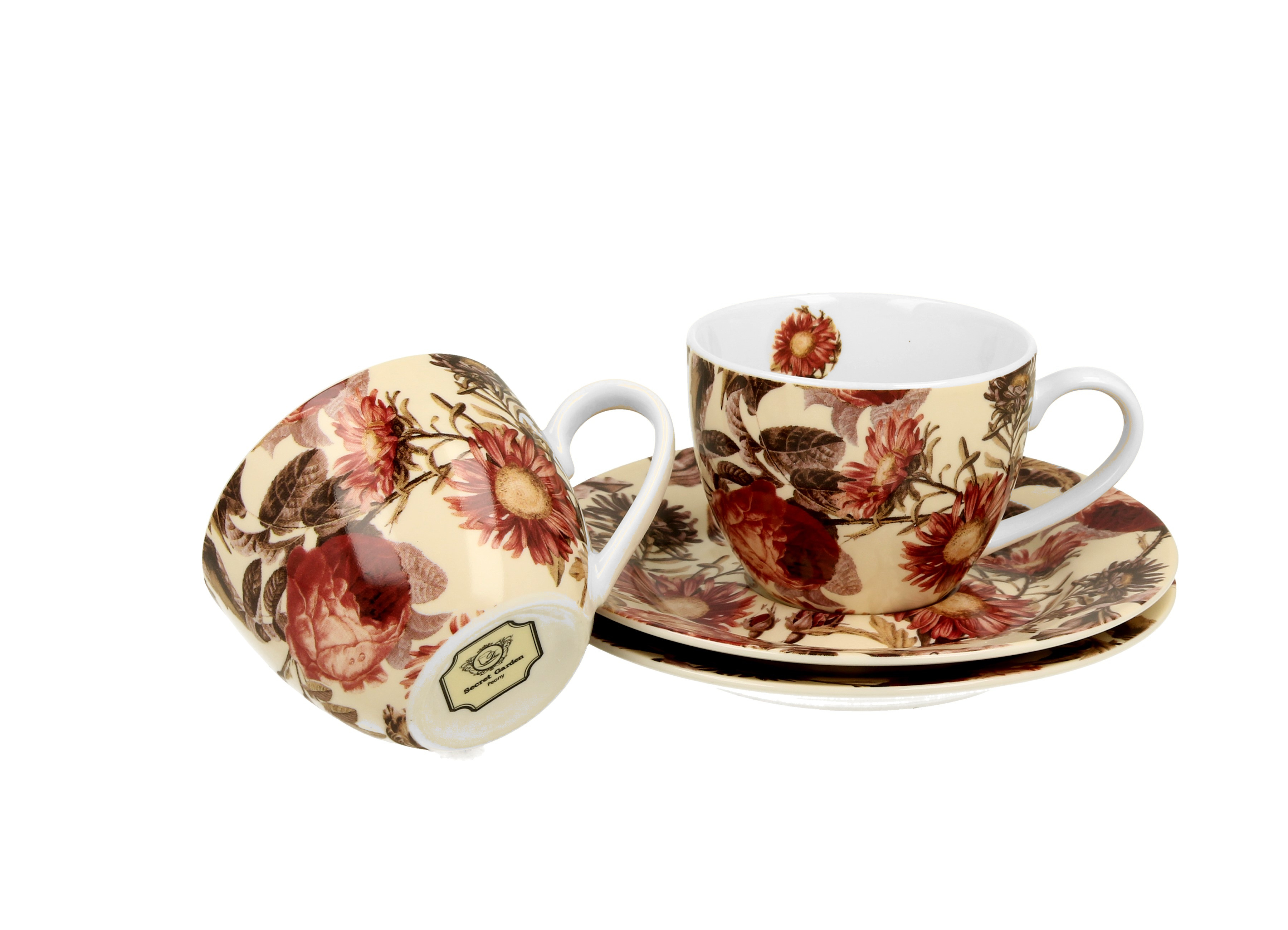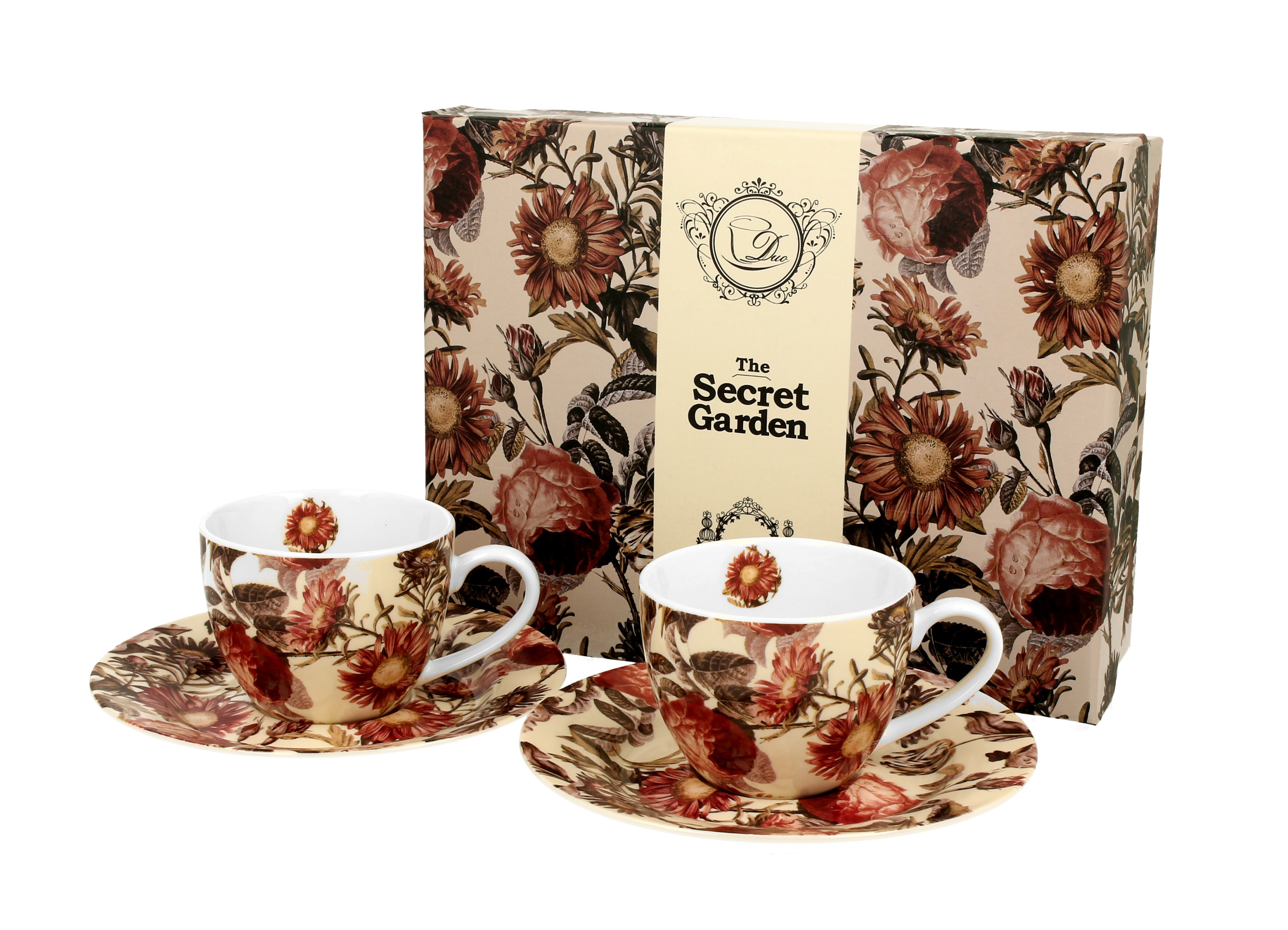 Komplet dwóch filiżanek espresso 90 ml ze spodkiem PEONY wchodzący w skład serii Secret Garden, wykonany z porcelany New Bone China, charakteryzującej się elegancką i naturalną kremowo - białą barwą z delikatnym połyskiem, a także wyjątkową wytrzymałością.
