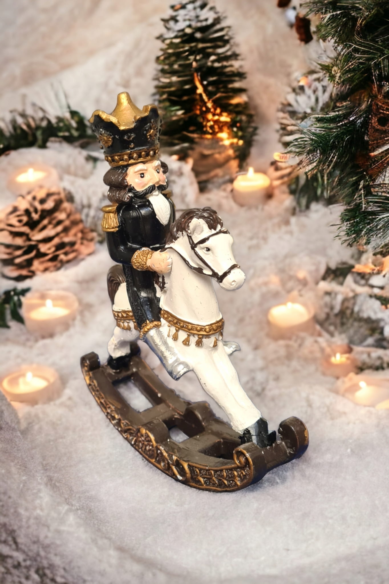 Odkryj niezwykłą dekorację, która wniesie do Twojego domu magiczny klimat świąt! Nasza figurka Dziadka do Orzechów na koniu na biegunach w klasycznych kolorach czerni i złota to kwintesencja tradycji i elegancji.