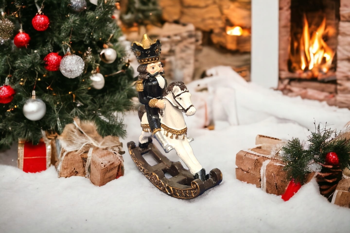 - Unikatowy design – realistyczna figurka Dziadka do Orzechów na klasycznym koniu na biegunach