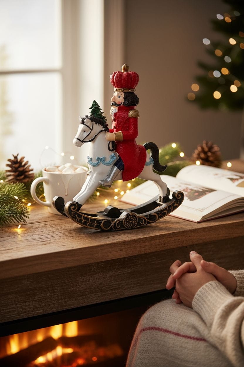Ten wyjątkowy Dziadek do Orzechów, dosiadający ozdobnego konika na biegunach, to dekoracja, która opowiada historię. Jego czerwony mundur, złota korona i miniaturowa choinka przy siodle tworzą kompozycję pełną świątecznego uroku. Idealny do wnętrz, które chcą zachwycać nie tylko blaskiem, ale i charakterem.