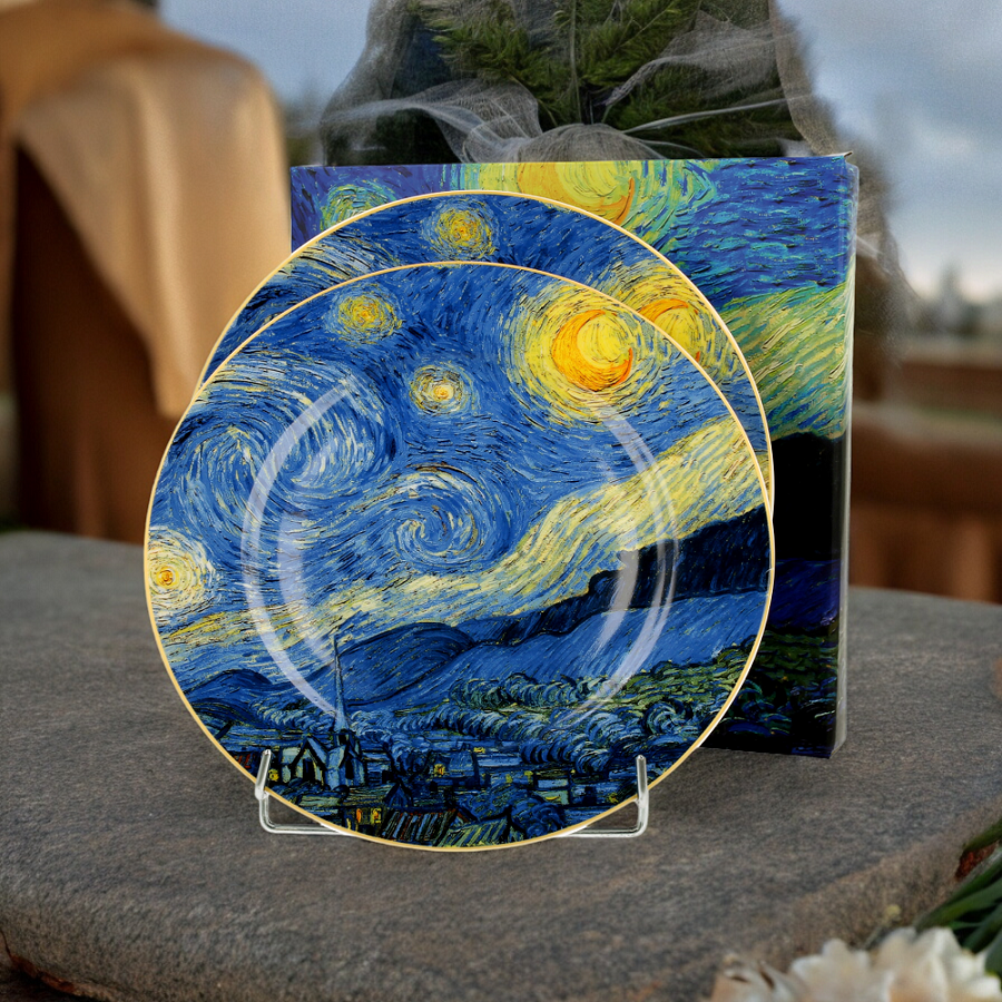 Komplet dwóch talerzy deserowych ‘STARRY NIGHT inspired by Van Gogh’ jest częścią serii Art Gallery. Wykonane są z porcelany New Bone China, która charakteryzuje się naturalnym kremowo-białym kolorem o delikatnym połysku oraz wyjątkową wytrzymałością, zachowując jednocześnie lekkość i elegancję .