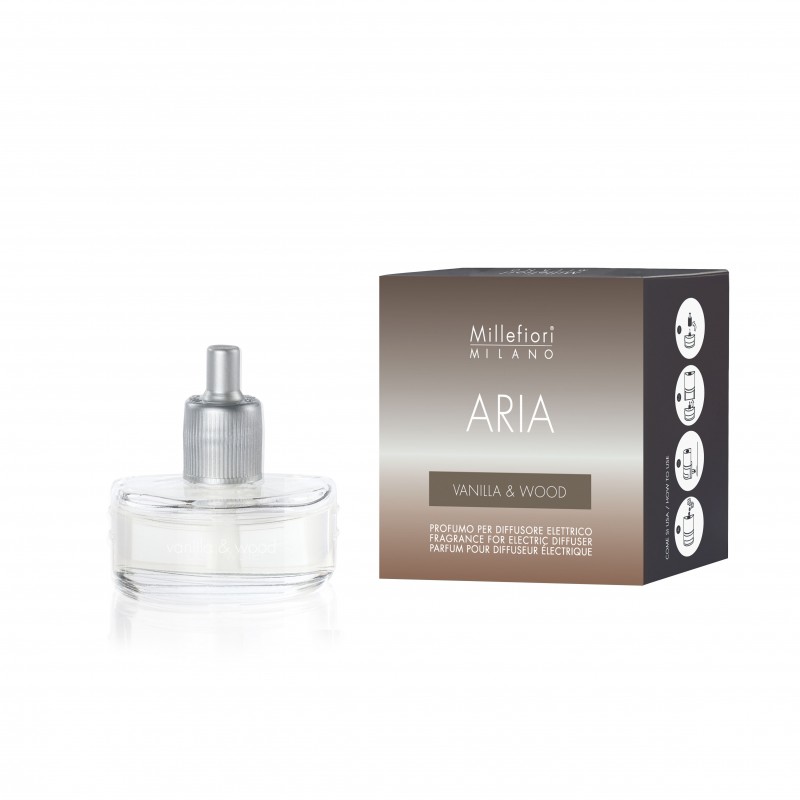 Millefiori Milano Aria VANILLA & WOOD – Wkład do elektrycznego odświeżacza powietrza. Otulająca słodycz wanilii wzbogacona nutą karmelu i głębią drzewnych akordów!