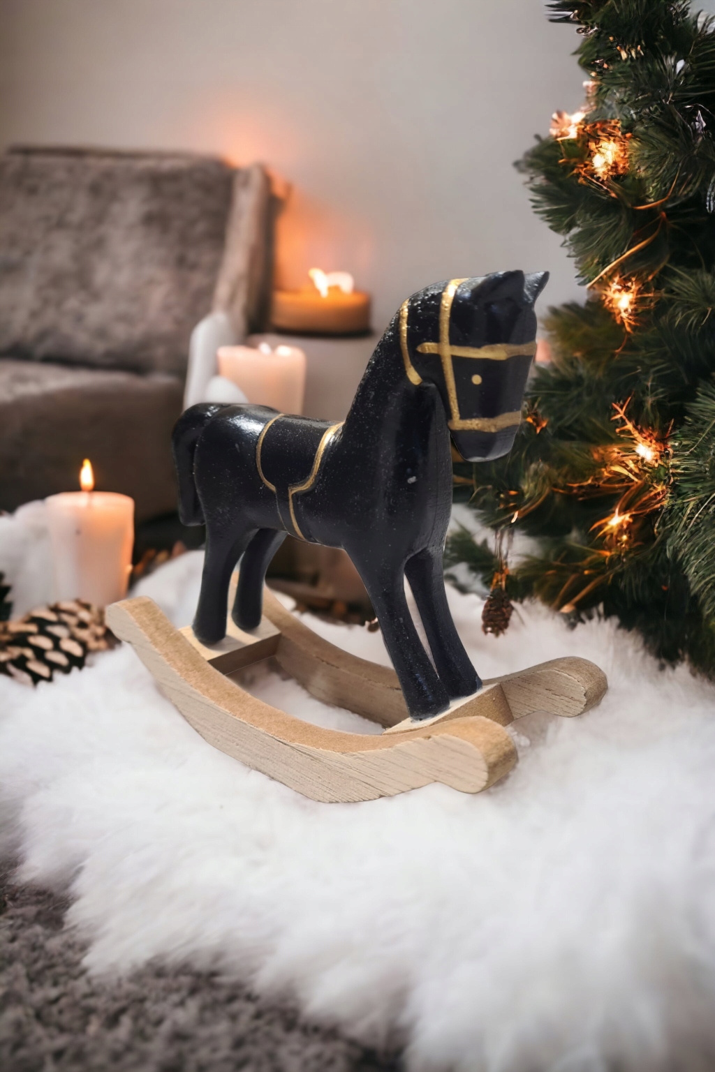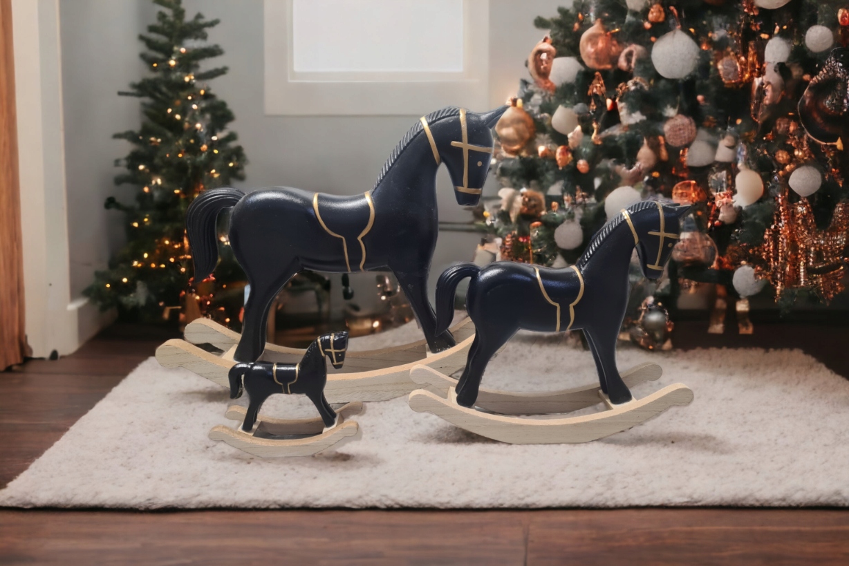 Dodaj odrobinę klasyki i elegancji do swojego wnętrza dzięki drewnianemu koniowi na biegunach w czarno-złotym wykończeniu. To niezwykła dekoracja, która łączy w sobie tradycję i luksus, przyciągając wzrok każdego miłośnika stylowych wnętrz.
