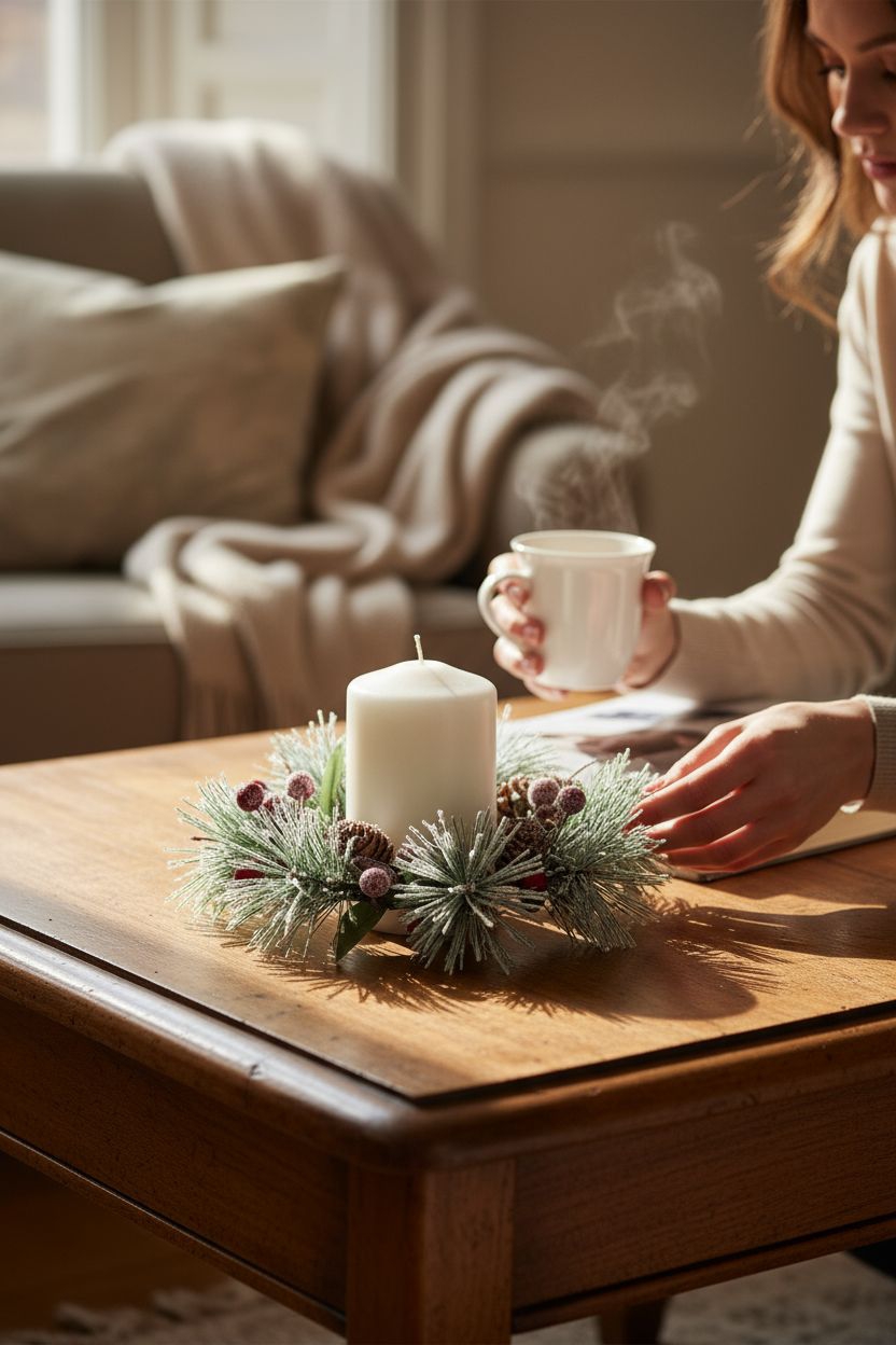 Ten kompaktowy wianek o średnicy 20 cm to gotowa baza pod świecę, która zamienia każdy stolik w przytulne centrum zimowej atmosfery. Otulony śnieżonym igliwiem, szyszkami i naturalnymi gałązkami, tworzy kompozycję pełną spokoju, elegancji i świątecznego uroku.